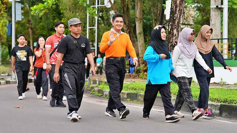 Bersama Sekretaris DPRD Kalteng H. Pajarudinnoor, politikus PKS Kalteng ini mengikuti Jalan Sehat dan Deklarasi Pemilu Damai se-Kalimantan Tengah yang digagas Pemprov Kalteng di kawasan Bundaran Besar, Kota Palangka Raya, Minggu (4/2/2024).